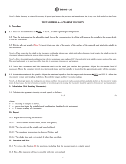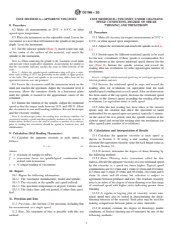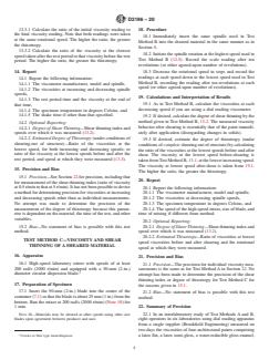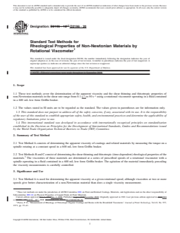 SIGNIFICANCE AND USE 3.1 Test Method A is used for determining the apparent viscosity at a given rotational speed, although viscosities at two or more speeds give better characterization of a non-Newtonian material than does a single viscosity measurement. 3.2 With Test Methods B and C, the extent of shear thinning is indicated by the drop in viscosity with increasing rotational speed. The degree of thixotropy is indicated by comparison of viscosities at increasing and decreasing rotational speeds (Test Method B), viscosity recovery (Test Method B), or viscosities before and after high shear (combination of Test Methods B and C). The high-shear treatment in Test Method C approximates shearing during paint application. The viscosity behavior measured after high shear is indicative of the characteristics of the paint soon after application. SCOPE 1.1 These test methods cover the determination of the apparent viscosity and the shear thinning and thixotropic properties of non-Newtonian materials in the shear rate range from 0.1 s−1 to 50 s−1 using a rotational viscometer operating in a fluid contained in a 600 mL low form Griffin beaker. 1.2 The values stated in SI units are to be regarded as the standard. The values given in parentheses are for information only. 1.3 This standard does not purport to address all of the safety concerns, if any, associated with its use. It is the responsibility of the user of this standard to establish appropriate safety, health, and environmental practices and determine the applicability of regulatory limitations prior to use. 1.4 This international standard was developed in accordance with internationally recognized principles on standardization established in the Decision on Principles for the Development of International Standards, Guides and Recommendations issued by the World Trade Organization Technical Barriers to Trade (TBT) Committee.
