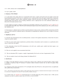 SIGNIFICANCE AND USE 5.1 The ICN value determined by this test method provides a measure of the ignition characteristics of diesel fuel oil used in compression ignition engines. 5.2 This test can be used by engine manufacturers, petroleum refiners, fuel producers and in commerce as a specification aid to relate or match fuels and engines. 5.3 The relationship of diesel fuel ICN determinations to the full scale, variable speed, variable load diesel engine is not completely understood. 5.4 This test can be applied to non-conventional diesel fuels. 5.5 This test determines ICN; it requires a sample of approximately 40 mL and a test time of approximately 25 min. 5.6 This test method is based on the Energy Institute Test Method IP 617. SCOPE 1.1 This test method covers the quantitative determination of the indicated cetane number (ICN) of conventional diesel fuel oils, and diesel fuel oils containing cetane number improver additives; it is applicable to products typical of Specification D975, Grades No.1-D and 2-D diesel fuel oils, European standard EN 590, and Canadian standards CAN/CGSB-3.517 and CAN/CGSB-3.520. The test method is also applicable to biodiesel, blends of diesel fuel oils containing biodiesel material (for example, materials as specified in Specifications D975, D6751, D7467 and European standards EN 14214, EN 16734, and EN 16709), diesel fuels from non-petroleum origin, hydrocarbon oils, diesel fuel oil blending components, aviation turbine fuels, and polyoxymethylene dimethyl ether (OME). 1.2 This test method utilizes a constant volume combustion chamber (CVCC) with direct fuel injection into heated compressed air. The apparatus is calibrated using blends of reference fuels. ICN is determined directly from ignition delay using an instrument specific reference fuel calibration curve. 1.3 This test method and its precision cover the calibrated range of 35 ICN to 85 ICN, inclusive. The analyzer can measure ICN outside the calibrated range, but the precision has not been determined. 1.4 The values stated in SI units are to be regarded as standard. No other units of measurement are included in this standard. 1.5 This standard does not purport to address all of the safety concerns, if any, associated with its use. It is the responsibility of the user of this standard to establish appropriate safety, health, and environmental practices and determine the applicability of regulatory limitations prior to use. Some specific hazards statements are given in Section 7 on Hazards. 1.6 This international standard was developed in accordance with internationally recognized principles on standardization established in the Decision on Principles for the Development of International Standards, Guides and Recommendations issued by the World Trade Organization Technical Barriers to Trade (TBT) Committee.