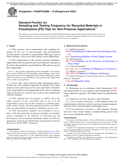 ASTM F3308/F3308M-19(2023) is a standard published by ASTM International. Its full title is "Standard Practice for Sampling and Testing Frequency for Recycled Materials in Polyethylene (PE) Pipe for Non-Pressure Applications". This standard covers: SIGNIFICANCE AND USE 4.1 The utilization of recycled materials in non-pressure thermoplastic pipe presents a potentially large outlet for this what is typically classified “waste” material. The proper use and qualification of this material is critical in assuring its long-term performance from both a structural and durability standpoint. 4.2 This practice defines minimum requirements and testing protocols and frequencies for these recycled materials with respect to their utilization in final thermoplastic pipe products. Each specific pipe standard has unique criteria that must be met in addition to the items described in this practice. 4.3 The purpose of this specification is for characterization of recycled plastics only and does not establish performance guidelines for such materials. Product specifications may be used in conjunction with this specification to establish performance specifications for a defined end-use and specific material type. SCOPE 1.1 This practice covers requirements and sampling frequency for the use of post-consumer and post-industrial recycled plastic materials in polyethylene (PE) pipe used in storm drainage, storm sewer and sanitary sewer applications. 1.2 The requirements of this practice provide definitions, requirements and test protocols for recycled plastic materials to be used in the production of polyethylene (PE) pipe for gravity flow applications. Note 1: Non-pressure applications pertain principally to any municipal or private facilities for land drainage, storm drainage, storm sewer, culvert and sanitary sewer applications. The products utilizing the criteria under this practice are not intended for any pressure pipe applications, such as water or gas pipelines. 1.3 Units—The values stated in either inch-pound units or SI units are to be regarded separately as standard. The values stated in each system may not be exact equivalents: therefore, each system shall be used independent of the other. Combining values from the two systems may result in non-conformance with the standard. 1.4 This standard does not purport to address all of the safety concerns, if any, associated with its use. It is the responsibility of the user of this standard to establish appropriate safety, health, and environmental practices and determine the applicability of regulatory limitations prior to use. 1.5 This international standard was developed in accordance with internationally recognized principles on standardization established in the Decision on Principles for the Development of International Standards, Guides and Recommendations issued by the World Trade Organization Technical Barriers to Trade (TBT) Committee.