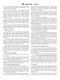 SIGNIFICANCE AND USE 4.1 The utilization of recycled materials in non-pressure thermoplastic pipe presents a potentially large outlet for this what is typically classified “waste” material. The proper use and qualification of this material is critical in assuring its long-term performance from both a structural and durability standpoint. 4.2 This practice defines minimum requirements and testing protocols and frequencies for these recycled materials with respect to their utilization in final thermoplastic pipe products. Each specific pipe standard has unique criteria that must be met in addition to the items described in this practice. 4.3 The purpose of this specification is for characterization of recycled plastics only and does not establish performance guidelines for such materials. Product specifications may be used in conjunction with this specification to establish performance specifications for a defined end-use and specific material type. SCOPE 1.1 This practice covers requirements and sampling frequency for the use of post-consumer and post-industrial recycled plastic materials in polyethylene (PE) pipe used in storm drainage, storm sewer and sanitary sewer applications. 1.2 The requirements of this practice provide definitions, requirements and test protocols for recycled plastic materials to be used in the production of polyethylene (PE) pipe for gravity flow applications. Note 1: Non-pressure applications pertain principally to any municipal or private facilities for land drainage, storm drainage, storm sewer, culvert and sanitary sewer applications. The products utilizing the criteria under this practice are not intended for any pressure pipe applications, such as water or gas pipelines. 1.3 Units—The values stated in either inch-pound units or SI units are to be regarded separately as standard. The values stated in each system may not be exact equivalents: therefore, each system shall be used independent of the other. Combining values from the two systems may result in non-conformance with the standard. 1.4 This standard does not purport to address all of the safety concerns, if any, associated with its use. It is the responsibility of the user of this standard to establish appropriate safety, health, and environmental practices and determine the applicability of regulatory limitations prior to use. 1.5 This international standard was developed in accordance with internationally recognized principles on standardization established in the Decision on Principles for the Development of International Standards, Guides and Recommendations issued by the World Trade Organization Technical Barriers to Trade (TBT) Committee.