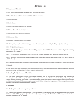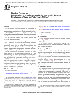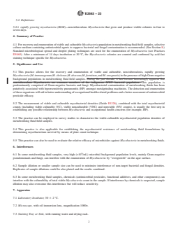 SIGNIFICANCE AND USE 5.1 This practice allows for the recovery and enumeration of viable and culturable, non-tuberculosis, rapidly growing Mycobacteria (M. immunogenum, M. chelonae, M. absessus, M. fortuitum, and M. smegmatis) in the presence of high Gram-negative background populations in metalworking fluid field samples. This population is predominantly comprised of Gram-negative bacteria and fungi. Mycobacterial contamination of metalworking fluids has been putatively associated with hypersensitivity pneumonitis (HP) amongst metalgrinding machinists. The detection and enumeration of these organisms will aid in better understanding of occupational health-related problems and a better assessment of antimicrobial pesticide efficacy. 5.2 The measurement of viable and culturable mycobacterial densities (Guide E1326), combined with the total mycobacterial counts (including viable culturable (VC), viable nonculturable (VNC) and nonviable (NV) counts), is usually the first step in establishing any possible relationship between Mycobacteria and occupational health concerns (for example, HP). 5.3 The practice can be employed in survey studies to characterize the viable-culturable mycobacterial population densities of metalworking fluid field samples. 5.4 This practice is also applicable for establishing the mycobacterial resistance of metalworking fluid formulations by determining mycobacterium survival by means of plate count technique. 5.5 This practice can also be used to evaluate the relative efficacy of microbicides against Mycobacteria in metalworking fluids. SCOPE 1.1 This practice covers the detection and enumeration of viable and culturable rapidly growing Mycobacteria (RGM), or non-tuberculosis Mycobacteria (NTM) in aqueous metalworking fluids (MWF) in the presence of high non-mycobacterial background population using standard microbiological culture methods. 1.2 The detection limit is one colony forming unit (CFU)/mL metalworking fluid. 1.3 This practice involves culture of organisms classified as Level 2 pathogens, and should be undertaken by a trained microbiologist in an appropriately equipped facility. The microbiologist should also be capable of distinguishing the diverse colonies of Mycobacteria from other microorganism colonies on a Petri dish and capable of confirming Mycobacteria by acid-fast staining method. 1.4 This standard does not purport to address all of the safety concerns, if any, associated with its use. It is the responsibility of the user of this standard to establish appropriate safety, health, and environmental practices and determine the applicability of regulatory limitations prior to use. 1.5 This international standard was developed in accordance with internationally recognized principles on standardization established in the Decision on Principles for the Development of International Standards, Guides and Recommendations issued by the World Trade Organization Technical Barriers to Trade (TBT) Committee.