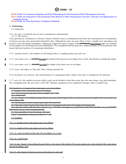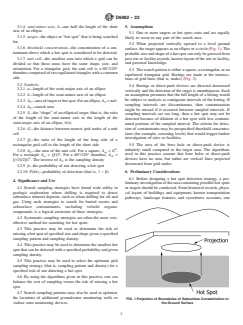 ASTM D6982-22 is a standard published by ASTM International. Its full title is "Standard Practice for Detecting Hot Spots Using Point-Net (Grid) Search Patterns". This standard covers: SIGNIFICANCE AND USE 4.1 Search sampling strategies have found wide utility in geologic exploration where drilling is required to detect subsurface mineral deposits, such as when drilling for oil and gas. Using such strategies to search for buried wastes and subsurface contaminants, including volatile organic compounds, is a logical extension of these strategies. 4.2 Systematic sampling strategies are often the most cost-effective method for searching for hot spots. 4.3 This practice may be used to determine the risk of missing a hot spot of specified size and shape given a specified sampling pattern and sampling density. 4.4 This practice may be used to determine the smallest hot spot that can be detected with a specified probability and given sampling density. 4.5 This practice may be used to select the optimum grid sampling strategy (that is, sampling pattern and density) for a specified risk of not detecting a hot spot. 4.6 By using the algorithms given in this practice, one can balance the cost of sampling versus the risk of missing a hot spot. 4.7 Search sampling patterns may also be used to optimize the locations of additional groundwater monitoring wells or vadose zone monitoring devices. SCOPE 1.1 This practice provides equations and nomographs, and a reference to a computer program, for calculating probabilities of detecting hot spots (that is, localized areas of soil or groundwater contamination) using point-net (that is, grid) search patterns. Hot spots, more generally referred to as targets, are presumed to be invisible on the ground surface. Hot spots may include former surface impoundments and waste disposal pits, as well as contaminant plumes in groundwater or the vadose zone. 1.2 For purposes of calculating detection probabilities, hot spots or buried contaminants are presumed to be elliptically shaped when projected vertically to the ground surface, and search patterns are square, rectangular, or rhombic. Assumptions about the size and shape of suspected hot spots are the primary limitations of this practice, and must be judged by historical information. A further limitation is that hot spot boundaries are usually not clear and distinct. 1.3 In general, this practice should not be used in lieu of surface geophysical methods for detecting buried objects, including underground utilities, where such buried objects can be detected by these methods (see Guide D6429). 1.4 Search sampling would normally be conducted during preliminary investigations of hazardous waste sites or hazardous waste management facilities (see Guide D5730). Sampling may be conducted by drilling or by direct-push methods. In contrast, guidance on sampling for the purpose of making statistical inferences about population characteristics (for example, contaminant concentrations) can be found in Guide D6311. 1.5 This standard does not purport to address all of the safety concerns, if any, associated with its use. It is the responsibility of the user of this standard to establish appropriate safety, health, and environmental practices and determine the applicability of regulatory limitations prior to use. 1.6 This international standard was developed in accordance with internationally recognized principles on standardization established in the Decision on Principles for the Development of International Standards, Guides and Recommendations issued by the World Trade Organization Technical Barriers to Trade (TBT) Committee.