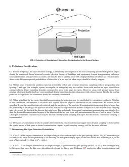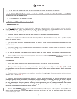 SIGNIFICANCE AND USE 4.1 Search sampling strategies have found wide utility in geologic exploration where drilling is required to detect subsurface mineral deposits, such as when drilling for oil and gas. Using such strategies to search for buried wastes and subsurface contaminants, including volatile organic compounds, is a logical extension of these strategies. 4.2 Systematic sampling strategies are often the most cost-effective method for searching for hot spots. 4.3 This practice may be used to determine the risk of missing a hot spot of specified size and shape given a specified sampling pattern and sampling density. 4.4 This practice may be used to determine the smallest hot spot that can be detected with a specified probability and given sampling density. 4.5 This practice may be used to select the optimum grid sampling strategy (that is, sampling pattern and density) for a specified risk of not detecting a hot spot. 4.6 By using the algorithms given in this practice, one can balance the cost of sampling versus the risk of missing a hot spot. 4.7 Search sampling patterns may also be used to optimize the locations of additional groundwater monitoring wells or vadose zone monitoring devices. SCOPE 1.1 This practice provides equations and nomographs, and a reference to a computer program, for calculating probabilities of detecting hot spots (that is, localized areas of soil or groundwater contamination) using point-net (that is, grid) search patterns. Hot spots, more generally referred to as targets, are presumed to be invisible on the ground surface. Hot spots may include former surface impoundments and waste disposal pits, as well as contaminant plumes in groundwater or the vadose zone. 1.2 For purposes of calculating detection probabilities, hot spots or buried contaminants are presumed to be elliptically shaped when projected vertically to the ground surface, and search patterns are square, rectangular, or rhombic. Assumptions about the size and shape of suspected hot spots are the primary limitations of this practice, and must be judged by historical information. A further limitation is that hot spot boundaries are usually not clear and distinct. 1.3 In general, this practice should not be used in lieu of surface geophysical methods for detecting buried objects, including underground utilities, where such buried objects can be detected by these methods (see Guide D6429). 1.4 Search sampling would normally be conducted during preliminary investigations of hazardous waste sites or hazardous waste management facilities (see Guide D5730). Sampling may be conducted by drilling or by direct-push methods. In contrast, guidance on sampling for the purpose of making statistical inferences about population characteristics (for example, contaminant concentrations) can be found in Guide D6311. 1.5 This standard does not purport to address all of the safety concerns, if any, associated with its use. It is the responsibility of the user of this standard to establish appropriate safety, health, and environmental practices and determine the applicability of regulatory limitations prior to use. 1.6 This international standard was developed in accordance with internationally recognized principles on standardization established in the Decision on Principles for the Development of International Standards, Guides and Recommendations issued by the World Trade Organization Technical Barriers to Trade (TBT) Committee.