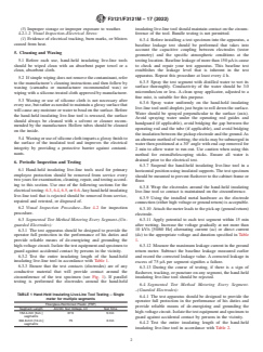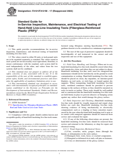 ASTM F3121/F3121M-17(2022) is a guide published by ASTM International. Its full title is "Standard Guide for In-Service Inspection, Maintenance, and Electrical Testing of Hand-Held Live-Line Insulating Tools (Fiberglass-Reinforced Plastic (FRP))". This standard covers: SIGNIFICANCE AND USE 3.1 Compliance with this guide should confirm known and acceptable quality of hand-held insulating live-line tools manufactured using fiberglass meeting Specification F711. The guidance herein is to be considered as a minimum requirement. 3.2 The user of this type of protective equipment should be knowledgeable of and instructed in the correct and safe inspection and use of this equipment. SCOPE 1.1 This guide provides recommendations for in-service inspection, maintenance, and electrical testing of hand-held insulating live-line tools. 1.2 The values stated in either SI units or inch-pound units are to be regarded separately as standard. The values stated in each system are not necessarily exact equivalents; therefore, to ensure conformance with the standard, each system shall be used independently of the other, and values from the two systems shall not be combined. 1.3 This standard does not purport to address all of the safety concerns, if any, associated with its use. It is the responsibility of the user of this standard to establish appropriate safety, health, and environmental practices and determine the applicability of regulatory limitations prior to use. 1.4 This international standard was developed in accordance with internationally recognized principles on standardization established in the Decision on Principles for the Development of International Standards, Guides and Recommendations issued by the World Trade Organization Technical Barriers to Trade (TBT) Committee.