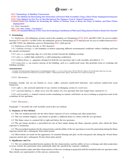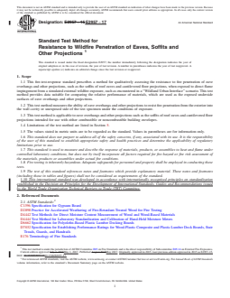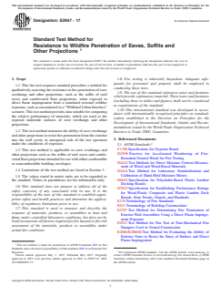 ASTM E2957-17 is a standard published by ASTM International. Its full title is "Standard Test Method for Resistance to Wildfire Penetration of Eaves, Soffits and Other Projections". This standard covers: SIGNIFICANCE AND USE 5.1 The test method described herein monitors the fire characteristics and the ability of eave overhangs and other projections to resist exterior fire penetration from underneath under the specified fire exposure conditions. 5.2 Representative joints and other characteristics of the eave overhang or projection shall be included in the test specimen when these details are representative of the end-use construction. 5.3 The test method does not apply to vents or perforated materials used to enclose or cap eaves, soffits, and other projections. Note 1: Test Methods E2912 and E2886/E2886M are methods used to test vents or perforated materials to resist direct flame impingement and flame penetration into the building. 5.4 The test method is devised for eave overhangs and other projections independent of the materials covering the building envelope. Note 2: Heat contribution from burning materials covering the building envelope beyond the prescribed fire exposure is not considered in this test method. 5.5 The test method does not necessarily represent the expected performance of eave overhang and projections under all actual fire conditions, but it does provide a basis for comparing eave overhang and projections materials when subjected to the test procedure described herein. 5.6 In this procedure, the test specimen is subjected to specific laboratory fire test conditions. If different test conditions are substituted or the anticipated end-use conditions are changed, it is not known whether it is possible by use of this test to predict changes in the performance characteristics measured. Therefore, the results are strictly valid only for the fire test conditions and construction tested. 5.7 The test method does not provide any basis for determining the fire resistance characteristics of eave overhangs or projections when exposed to a fire originating in the building. 5.8 The test method does not address interior or exterior flame spread. SCOPE 1.1 This fire-test-response standard prescribes a method for qualitatively assessing the resistance to fire penetration of eave overhangs and other projections, such as the soffits of roof eaves and cantilevered floor projections, when exposed to direct flame impingement from a simulated external wildfire exposure, such as encountered in a “Wildland Urban Interface” scenario. This test method provides data suitable for comparing the relative performance of materials, which are used as the exposed underside surfaces of eave overhangs and other projections. 1.2 This test method measures the ability of eave overhangs and other projections to resist fire penetration from the exterior into the wall cavity or unexposed side of the test specimen under the conditions of exposure. 1.3 This test method is applicable to eave overhangs and other projections such as the soffits of roof eaves and cantilevered floor projections intended for use with either combustible or noncombustible building envelopes. 1.4 Limitations of the test method are listed in Section 5. 1.5 The values stated in metric units are to be regarded as the standard. Values in parentheses are for information only. 1.6 This standard does not purport to address all of the safety concerns, if any, associated with its use. It is the responsibility of the user of this standard to establish appropriate safety and health practices and determine the applicability of regulatory limitations prior to use. 1.7 This standard is used to measure and describe the response of materials, products, or assemblies to heat and flame under controlled laboratory conditions, but does not by itself incorporate all factors required for fire hazard or fire risk assessment of the materials, products or assemblies under actual fire conditions. 1.8 Fire testing is inherently hazardous. Adequate safeguards for personnel and property shall be employed in conducting these tests. 1.9 The t...