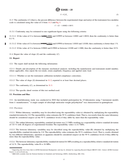 ASTM E2425-21 is a standard published by ASTM International. Its full title is "Standard Test Method for Loss Modulus Conformance of Dynamic Mechanical Analyzers". This standard covers: SIGNIFICANCE AND USE 5.1 This test method demonstrates conformity of a dynamic mechanical analyzer at an isothermal temperature of 21 °C. 5.2 Dynamic mechanical analysis experiments often use linear temperature change. This test method does not address the effect of that change in temperature on the loss modulus. 5.3 This test method may be used in research and development, specification acceptance, and quality control or assurance. SCOPE 1.1 This test method describes the performance confirmation or measurement of conformance for the loss modulus scale of a commercial or custom-built dynamic mechanical analyzer (DMA) at 21 °C using ultra-high molecular weight polyethylene as a reference material. 1.2 The values stated in SI units are to be regarded as standard. No other units of measurement are included in this standard. 1.3 This standard does not purport to address all of the safety concerns, if any, associated with its use. It is the responsibility of the user of this standard to establish appropriate safety, health, and environmental practices and determine the applicability of regulatory limitations prior to use. 1.4 This international standard was developed in accordance with internationally recognized principles on standardization established in the Decision on Principles for the Development of International Standards, Guides and Recommendations issued by the World Trade Organization Technical Barriers to Trade (TBT) Committee.