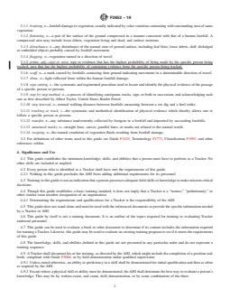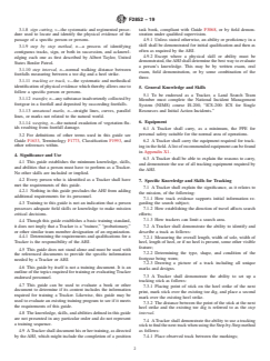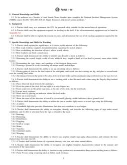 SIGNIFICANCE AND USE 4.1 This guide establishes the minimum knowledge, skills, and abilities that a person must have to perform as a Tracker. No other skills are included or implied. 4.2 Every person who is identified as a Tracker shall have met the requirements of this guide. 4.2.1 Nothing in this guide precludes the AHJ from adding additional requirements for its personnel. 4.3 Training to this guide is not an indication that a person possesses adequate field skills or knowledge to make mission critical decisions. 4.4 Though this guide establishes a basic training standard, it does not imply that a Tracker is a “trainee,” “probationary,” or other similar team member designation of an organization. 4.4.1 Determining the requirements and qualifications for a Tracker is the responsibility of the AHJ. 4.5 This guide does not stand alone and must be used with the referenced documents to provide the specific information needed by a Tracker or AHJ. 4.6 This guide by itself is not a training document. It is an outline of the topics required for training or evaluating Tracker endorsed personnel. 4.7 This guide can be used to evaluate a book or other document to determine if its content includes the information required for training a Tracker. Likewise, this guide may be used to evaluate an existing training program to see if it meets the requirements of this guide. 4.8 The knowledge, skills, and abilities defined in this guide are not presented in any particular order and do not represent a training sequence. 4.9 A Tracker shall document his or her training, as directed by the AHJ, which might include the completion of a position task book, compliant with Guide F3068, or by field demonstration under qualified supervision. 4.9.1 Unless stated otherwise, an ability or proficiency in a skill shall be demonstrated for initial qualification and then as often as required by the AHJ. 4.9.2 Except where a physical skill or ability must be demonstrated, the AHJ sh... SCOPE 1.1 This guide establishes the minimum training, including knowledge, skills, and abilities, required for personnel operating as Trackers in support of a land search effort. 1.2 A Tracker Endorsement alone is not sufficient to indicate that an individual has the knowledge, skills, or abilities to perform any specific duties, including search and rescue operations, beyond those defined within this guide. 1.3 A Tracker tracks on the surface of the land only, including urban or disaster areas that may be isolated or have lost supporting infrastructure. 1.4 This guide does not provide the minimum training requirements for tracking in partially or fully collapsed structures, in water, in confined spaces, or underground (such as in caves, mines, and tunnels). 1.5 Human land SAR resources that may utilize personnel trained to this guide are classified in Classification F1993. 1.5.1 Individuals trained to this guide are qualified to operate on teams or crews classified as Category – Land Search of Kind – Tracking. 1.5.2 Further training may be required before Tracking Land Search personnel may participate on particular Category or Kind of SAR resource, depending on local needs, regulations, or policies of the Authority Having Jurisdiction (AHJ). 1.6 This standard does not purport to address all of the safety concerns, if any, associated with its use. It is the responsibility of the user of this standard to establish appropriate safety, health, and environmental practices and determine the applicability of regulatory limitations prior to use. 1.7 This international standard was developed in accordance with internationally recognized principles on standardization established in the Decision on Principles for the Development of International Standards, Guides and Recommendations issued by the World Trade Organization Technical Barriers to Trade (TBT) Committee.