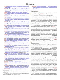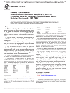 ASTM D7035-21 specifies a standard test method for the determination of metals and metalloids in airborne particulate matter using Inductively Coupled Plasma Atomic Emission Spectrometry (ICP-AES). Developed by ASTM International, this method plays a critical role in occupational health by providing a validated procedure for measuring workplace exposures to a wide range of metallic and metalloid elements. Its precise approach benefits industrial hygienists, public health professionals, analytical laboratories, and workplace safety agencies by enabling consistent and accurate air quality monitoring.
