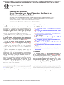 ASTM C423-23 is a standard published by ASTM International. Its full title is "Standard Test Method for Sound Absorption and Sound Absorption Coefficients by the Reverberation Room Method". This standard covers: SIGNIFICANCE AND USE 5.1 Measurement of the sound absorption of a room is part of the procedure for other acoustical measurements, such as determining the sound power level of a noise source or the sound transmission loss of a partition. It is also used in certain calculations such as predicting the sound pressure level in a room when the sound power level of a noise source in the room is known. 5.2 The sound absorption coefficient of a surface is a property of the material composing the surface. It is ideally defined as the fraction of the randomly incident sound power absorbed by the surface, but in this test method it is operationally defined in 4.2. The relationship between the theoretically defined and the operationally measured coefficients is under continuing study. 5.3 Diffraction effects4 usually cause the apparent area of a specimen to be greater than its geometrical area, thereby increasing the coefficients measured according to this test method. When the test specimen is highly absorptive, these values may exceed unity. 5.4 The coefficients measured by this test method should be used with caution because not only are the areas encountered in practical usage usually larger than the test specimen, but also the sound field is rarely diffuse. In the laboratory, measurements must be made under reproducible conditions, but in practical usage the conditions that determine the effective absorption are often unpredictable. Regardless of the differences and the necessity for judgment, coefficients measured by this test method have been used successfully by architects and consultants in the acoustical design of architectural spaces. 5.5 Field Measurements—When sound absorption measurements are made in a building in which the size and shape of the room are not under the operator's control, the approximation to a diffuse sound field is not likely to be very close. This matter should be considered when assessing the accuracy of measurements made under field conditions. (See Te... SCOPE 1.1 This test method covers the measurement of sound absorption in a reverberation room by measuring decay rate. Procedures for measuring the absorption of a room, the absorption of an object, such as an office screen, and the sound absorption coefficients of a specimen of sound absorptive material, such as acoustical ceiling tile, are described. 1.2 Field Measurements—Although this test method covers laboratory measurements, the test method described in 4.1 can be used for making field measurements of the absorption of rooms (see also 5.5). A method to measure the absorption of rooms in the field is described in Test Method E2235. 1.3 This test method includes information on laboratory accreditation (see Annex A1), asymmetrical screens (see Annex A2), and reverberation room qualification (see Annex A3). 1.4 The values stated in SI units are to be regarded as standard. No other units of measurement are included in this standard. 1.5 This standard does not purport to address all of the safety concerns, if any, associated with its use. It is the responsibility of the user of this standard to establish appropriate safety, health, and environmental practices and determine the applicability of regulatory limitations prior to use. 1.6 This international standard was developed in accordance with internationally recognized principles on standardization established in the Decision on Principles for the Development of International Standards, Guides and Recommendations issued by the World Trade Organization Technical Barriers to Trade (TBT) Committee.