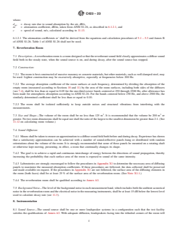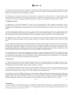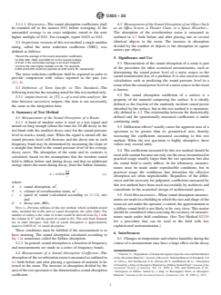 SIGNIFICANCE AND USE 5.1 Measurement of the sound absorption of a room is part of the procedure for other acoustical measurements, such as determining the sound power level of a noise source or the sound transmission loss of a partition. It is also used in certain calculations such as predicting the sound pressure level in a room when the sound power level of a noise source in the room is known. 5.2 The sound absorption coefficient of a surface is a property of the material composing the surface. It is ideally defined as the fraction of the randomly incident sound power absorbed by the surface, but in this test method it is operationally defined in 4.2. The relationship between the theoretically defined and the operationally measured coefficients is under continuing study. 5.3 Diffraction effects4 usually cause the apparent area of a specimen to be greater than its geometrical area, thereby increasing the coefficients measured according to this test method. When the test specimen is highly absorptive, these values may exceed unity. 5.4 The coefficients measured by this test method should be used with caution because not only are the areas encountered in practical usage usually larger than the test specimen, but also the sound field is rarely diffuse. In the laboratory, measurements must be made under reproducible conditions, but in practical usage the conditions that determine the effective absorption are often unpredictable. Regardless of the differences and the necessity for judgment, coefficients measured by this test method have been used successfully by architects and consultants in the acoustical design of architectural spaces. 5.5 Field Measurements—When sound absorption measurements are made in a building in which the size and shape of the room are not under the operator's control, the approximation to a diffuse sound field is not likely to be very close. This matter should be considered when assessing the accuracy of measurements made under field conditions. (See Te... SCOPE 1.1 This test method covers the measurement of sound absorption in a reverberation room by measuring decay rate. Procedures for measuring the absorption of a room, the absorption of an object, such as an office screen, and the sound absorption coefficients of a specimen of sound absorptive material, such as acoustical ceiling tile, are described. 1.2 Field Measurements—Although this test method covers laboratory measurements, the test method described in 4.1 can be used for making field measurements of the absorption of rooms (see also 5.5). A method to measure the absorption of rooms in the field is described in Test Method E2235. 1.3 This test method includes information on laboratory accreditation (see Annex A1), asymmetrical screens (see Annex A2), and reverberation room qualification (see Annex A3). 1.4 The values stated in SI units are to be regarded as standard. No other units of measurement are included in this standard. 1.5 This standard does not purport to address all of the safety concerns, if any, associated with its use. It is the responsibility of the user of this standard to establish appropriate safety, health, and environmental practices and determine the applicability of regulatory limitations prior to use. 1.6 This international standard was developed in accordance with internationally recognized principles on standardization established in the Decision on Principles for the Development of International Standards, Guides and Recommendations issued by the World Trade Organization Technical Barriers to Trade (TBT) Committee.