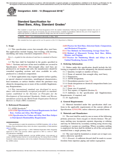 ASTM A322-13(2018)e1 is a technical specification published by ASTM International. Its full title is "Standard Specification for Steel Bars, Alloy, Standard Grades". This standard covers: ABSTRACT This specification covers hot-wrought alloy steel bars. The steel shall be made by one or more of the following primary processes: open-hearth, basic-oxygen, or electric-furnace. The primary melting may incorporate separate degassing or refining and may be followed by secondary melting using electro-slag remelting or vacuum arc remelting. Where secondary remelting is employed, the heat shall be defined as all of the cast product remelted from a single primary heat. The steel shall be furnished as strand cast or ingot cast. Immediately after hot forming, the bars shall be allowed to cool to a temperature below the critical range under suitable conditions to prevent imperfections caused by too rapid cooling. The bars shall be free of pipe, cracks, and flakes. Within the limits of good manufacturing and inspection practices, the bars shall be free of injurious seams, laps, segregation, or other imperfections which are due to their nature, degree, or extent, will interfere with the use of the material in machining or fabrication of suitable parts. SCOPE 1.1 This specification covers hot-wrought alloy steel bars. Bar applications include forging, heat treating, cold drawing, machining and many structural components (Note 1). Note 1: A guide for the selection of steel bars is contained in Practice A400. 1.2 The bars shall be furnished in the grades specified in Table 1. Sections and sizes of bar steel available are covered in Specification A29/A29M. Hot-wrought alloy steel bars are produced in cut lengths and coils; the manufacturer should be consulted regarding sections and sizes available in coils, produced to a chemical composition. 1.3 Some applications may require superior surface quality, or special chemical restrictions, metallurgical characteristics, heat treatment, or surface finishes which the purchaser may obtain by designating one or more of the available Supplementary Requirements. 1.4 This international standard was developed in accordance with internationally recognized principles on standardization established in the Decision on Principles for the Development of International Standards, Guides and Recommendations issued by the World Trade Organization Technical Barriers to Trade (TBT) Committee.