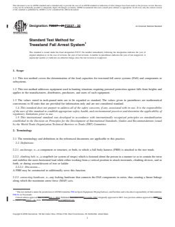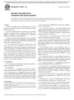 ASTM F2337-22 is a standard published by ASTM International. Its full title is "Standard Test Method for Treestand Fall Arrest System". This standard covers: SIGNIFICANCE AND USE 4.1 This test method is intended to measure the maximum arrest force and dynamic strength on treestand FAS and components or subsystems. This test is intended for program quality assurance and production quality control purposes. It is not intended to be an independent material or product acceptance test. SCOPE 1.1 This test method covers the determination of the load capacities for treestand fall arrest systems (FAS) and components or subsystems. 1.2 This test method addresses equipment used in hunting situations requiring personal protection against falls from heights and applies to the manufacturers, distributors, purchasers, and users of such equipment. 1.3 The values stated in inch-pound units are to be regarded as standard. The values given in parentheses are mathematical conversions to SI units that are provided for information only and are not considered standard. 1.4 This standard does not purport to address all of the safety concerns, if any, associated with its use. It is the responsibility of the user of this standard to establish appropriate safety, health, and environmental practices and determine the applicability of regulatory limitations prior to use. 1.5 This international standard was developed in accordance with internationally recognized principles on standardization established in the Decision on Principles for the Development of International Standards, Guides and Recommendations issued by the World Trade Organization Technical Barriers to Trade (TBT) Committee.