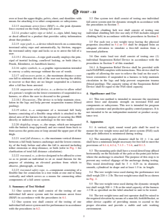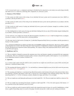 SIGNIFICANCE AND USE 4.1 This test method is intended to measure the maximum arrest force and dynamic strength on treestand FAS and components or subsystems. This test is intended for program quality assurance and production quality control purposes. It is not intended to be an independent material or product acceptance test. SCOPE 1.1 This test method covers the determination of the load capacities for treestand fall arrest systems (FAS) and components or subsystems. 1.2 This test method addresses equipment used in hunting situations requiring personal protection against falls from heights and applies to the manufacturers, distributors, purchasers, and users of such equipment. 1.3 The values stated in inch-pound units are to be regarded as standard. The values given in parentheses are mathematical conversions to SI units that are provided for information only and are not considered standard. 1.4 This standard does not purport to address all of the safety concerns, if any, associated with its use. It is the responsibility of the user of this standard to establish appropriate safety, health, and environmental practices and determine the applicability of regulatory limitations prior to use. 1.5 This international standard was developed in accordance with internationally recognized principles on standardization established in the Decision on Principles for the Development of International Standards, Guides and Recommendations issued by the World Trade Organization Technical Barriers to Trade (TBT) Committee.