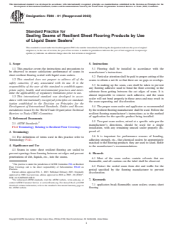 ASTM F693-01(2023) is a standard published by ASTM International. Its full title is "Standard Practice for Sealing Seams of Resilient Sheet Flooring Products by Use of Liquid Seam Sealers". This standard covers: SIGNIFICANCE AND USE 4.1 Seams in some sheet resilient flooring are sealed to prevent openings from forming between cut edges and prevent penetrations of dirt, liquids, etc., into the seams. SCOPE 1.1 This practice covers the instructions and precautions to be observed to ensure satisfactory performance of seams in sheet resilient flooring sealed with liquid seam sealers. 1.2 This standard does not purport to address all of the safety concerns, if any, associated with its use. It is the responsibility of the user of this standard to establish appropriate safety, health, and environmental practices and determine the applicability of regulatory limitations prior to use. 1.3 This international standard was developed in accordance with internationally recognized principles on standardization established in the Decision on Principles for the Development of International Standards, Guides and Recommendations issued by the World Trade Organization Technical Barriers to Trade (TBT) Committee.