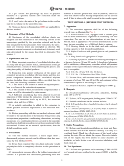SIGNIFICANCE AND USE 5.1 Many important properties of crosslinked ethylene plastics vary with the gel content. Hence, determination of the gel content provides a means of both controlling the process and rating the quality of finished products. 5.2 Extraction tests permit verification of the proper gel content of any given crosslinked ethylene plastic and they also permit comparison between different crosslinked ethylene plastics, including those containing fillers, provided that, for the latter, the following conditions are met: 5.2.1 The filler is not soluble in either decahydronaphthalene or xylenes at the extraction temperature. 5.2.2 The amount of filler present in the compound either is known or will be determined by other means. 5.2.3 Sufficient crosslinking has been achieved to prevent migration of filler during the extraction. Usually it has been found that, at extraction levels up to 50 %, the extractant remains clear and free of filler. 5.3 A suitable antioxidant is added to the extractant to inhibit possible oxidative degradation at the extraction temperatures. 5.4 Before proceeding with this test method, reference shall be made to the specification of the material being tested. Any test specimen preparation, conditioning, dimensions, or testing parameters, or a combination thereof, covered in the materials specification shall take precedence over those mentioned in this test method. If there are no material specifications, then the default conditions apply. SCOPE 1.1 The gel content (insoluble fraction) produced in ethylene plastics by crosslinking is determined by extracting with solvents such as decahydronaphthalene or xylenes. The methods described herein are applicable to crosslinked ethylene plastics of all densities, including those containing fillers, and all provide corrections for the inert fillers present in some of those compounds. 1.2 Test Method A, which permits most complete extraction in least time, is to be used for referee tests, but two alternative nonreferee Test Methods B and C are also described. Test Method B differs from the referee test method only in sample preparation; that is, it requires use of shavings taken at selected points in cable insulation, for example, rather than the ground sample required by the referee test method. Because the shaved particles are larger, less total surface per sample is exposed to the extractant, so this test method ordinarily yields extraction values about 1 to 2 % lower than the referee method. Test Method C requires that a specimen in one piece be extracted in xylenes at a constant temperature of 110°C. At this temperature and with a one-piece specimen, even less extraction occurs (from 3 to 9 % less than the referee test method), this method permits swell ratio (a measure of the degree of crosslinking in the gel phase) be determined. 1.3 Extraction tests are made on articles of any shape. They have been particularly useful for electrical insulations since specimens can be selected from those portions of the insulation most susceptible to insufficient crosslinking. 1.4 The values stated in either SI units or inch-pound units are to be regarded separately as standard. The values stated in each system are not necessarily exact equivalents; therefore, to ensure conformance with the standard, each system shall be used independently of the other, and values from the two systems shall not be combined. Note 1: This test method is equivalent to ISO 10147, Method B. It is not equivalent to ISO 10147 in any other measurement or section. 1.5 This standard does not purport to address all of the safety concerns, if any, associated with its use. It is the responsibility of the user of this standard to establish appropriate safety, health, and environmental practices and determine the applicability of regulatory limitations prior to use. Specific precautionary statements are given in Sections 6, 9, and 24. 1.6 This int...