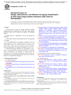 ASTM E1025-18 is a standard published by ASTM International. Its full title is "Standard Practice for Design, Manufacture, and Material Grouping Classification of Hole-Type Image Quality Indicators (IQI) Used for Radiography". This standard covers: ABSTRACT This practice covers the design, material grouping classification, and manufacture of hole-type image quality indicators (IQI) used to indicate the quality of X-ray and gamma-ray radiologic images. SCOPE 1.1 This practice2 covers the design, material grouping classification, and manufacture of hole-type image quality indicators (IQI) used to indicate the quality of radiologic images. 1.2 This practice is applicable to X-ray and gamma-ray radiology. 1.3 The values stated in inch-pound units are to be regarded as standard. 1.4 This standard does not purport to address all of the safety concerns, if any, associated with its use. It is the responsibility of the user of this standard to establish appropriate safety, health, and environmental practices and determine the applicability of regulatory limitations prior to use. 1.5 This international standard was developed in accordance with internationally recognized principles on standardization established in the Decision on Principles for the Development of International Standards, Guides and Recommendations issued by the World Trade Organization Technical Barriers to Trade (TBT) Committee.