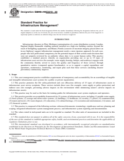SIGNIFICANCE AND USE 4.1 Purpose—This practice provides a framework for an authority to assess, plan, and execute: (1) the construction of new systems of tangible and intangible infrastructure; and (2) operate, maintain, monitor, and repair existing systems of infrastructure assets so as to maximize their use value by providing desired services for the benefit of infrastructure asset service recipients of the authority’s unit of government or private sector organization. 4.2 How to Use Information—The information generated by this practice is used to assess the quality and frequency of delivered infrastructure asset services, which then provides the basis for changing the amounts or proportions of funding for one, many, or all types of infrastructure assets in the subsequent cycle of assessment, planning, and execution. The user shall identify an acceptable score for each infrastructure asset system being assessed with the practice (using resources listed in Table 4) and is encouraged to set targets for higher scores for each subsequent cycle of assessment (so that continuous improvement may be achieved) that shall not exceed four years. 4.3 Who Should Use Information—The authority should use the generated information from the use of this practice to: (1) life safety-prioritize capital expenditures (extraordinary outlays) and spending on operations, maintenance, monitoring, and repair (ordinary outlays) of each infrastructure asset system that is assessed; (2) ensure costs are based on a life cycle basis, and, (3) triage those expenditures when insufficient funds limit the number of prioritized infrastructure asset services that can be improved or upgraded. The infrastructure asset service recipient should use generated information from the use of this practice to: (1) advocate for improved services; (2) coordinate communication among other infrastructure asset service recipients to voice concerns about service quality, frequency, and equity; and (3) identify new sources of revenu... SCOPE 1.1 This asset management practice establishes requirements of transparency and accountability for an assemblage of tangible and intangible infrastructure asset systems for a public or private organization. 1.2 This practice promotes the life safety-prioritized and cost efficacious delivery of 15 types of infrastructure assets to infrastructure asset service recipients. These services include direct uses (for example, water supply or police protection) and indirect uses (for example, preventing adverse impacts on the environment while minimizing nature’s adverse impacts on infrastructure assets). 1.3 This practice may be used as the basis for training guides for infrastructure asset system employees and operators. 1.4 This practice provides an acceptability framework for 15 systems of infrastructure assets, including (1) potable water supply, (2) food systems, (3) sewage and storm water systems, (4) buildings, (5) healthcare, (6) security, (7) power, (8) communication, (9) transit and travel, (10) waste disposal, (11) education, (12) cultural heritage, (13) recreation and entertainment, (14) nature, and (15) financial systems. 1.5 This practice is composed of the following sections: referenced documents; terminology; significance and use; planning and scoping; integrated infrastructure system management process; and infrastructure system reporting and documentation. 1.6 The values stated in inch-pound units are to be regarded as standard. No other units of measurement are included in this standard. 1.7 This standard does not purport to address all of the safety concerns, if any, associated with its use. It is the responsibility of the user of this standard to establish appropriate safety, health, and environmental practices and determine the applicability of regulatory limitations prior to use. 1.8 This international standard was developed in accordance with internationally recognized principles on s...