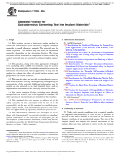 ASTM F1408-20a is a standard published by ASTM International. Its full title is "Standard Practice for Subcutaneous Screening Test for Implant Materials". This standard covers: SIGNIFICANCE AND USE 4.1 This practice is a guideline for a short-term screening test for the evaluation of the tissue response to materials that may be selected for implantation in the human body and should be done in accordance with good laboratory practices. This test may be performed prior to long-term testing (for example, Practice F981) to eliminate unsuitable candidate materials early and to avoid unnecessary animal testing. 4.2 This practice may be used to detect toxic effects of materials in general (see Appendix X1). However, it is particularly suitable for the testing of materials that are intended to have contact with subcutaneous tissues or soft tissues in general. For materials intended to be inserted specifically into muscle tissues, Practice F763 should be considered as a short-term test method. 4.3 The suggested implant specimens are cylindrical. A special grooved type of cylinder may be used (see Fig. X2.1 of Appendix X2) to allow tissue interlocking that could keep the implant in place and minimize tissue irritation through motion at the interface that otherwise could contribute to increased variance of the results. In case ungrooved cylinders are used (see Fig. X1.2 of Appendix X2), probable motion at the implant/tissue interface must be taken into account. Control cylinders should be shaped like the test cylinders. 4.4 The type of surface preparation of the specimens can affect the tissue reaction; therefore the preparation procedure should be noted in the report. The test may be used to compare the effect of different surface structures or conditions of the same material or to assess the effect of various treatments of modifications of a material. Note 1: If this method is used for material research, testing for endotoxin prior to implantation should be considered. SCOPE 1.1 This practice covers a short-term testing method to screen the subcutaneous tissue reaction to implant candidate materials in small laboratory animals. The material may be dense or porous. This method may not work for absorbable materials, depending on the absorption kinetics. The tissue reactions will be evaluated in comparison to those evoked by control materials that are accepted as clinical implant materials. 1.2 This practice, along with other appropriate biological tests (including other ASTM test methods), may be used to assess the biocompatibility of candidate materials for use in the fabrication of devices for clinical application. It may also be applied to evaluate the effect of special surface textures and preparations of known materials. 1.3 This practice does not provide a comprehensive assessment of the systemic toxicity, carcinogenicity, teratogenicity, or mutagenicity of the material. Additional information may be needed on the material in its final finished form, such as implantation assessment at the clinically relevant location. 1.4 The values stated in SI units, including units officially accepted for use with SI, are to be regarded as standard. No other systems of measurement are included in this standard. 1.5 This standard does not purport to address all of the safety concerns, if any, associated with its use. It is the responsibility of the user of this standard to establish appropriate safety, health, and environmental practices and determine the applicability of regulatory limitations prior to use. 1.6 This international standard was developed in accordance with internationally recognized principles on standardization established in the Decision on Principles for the Development of International Standards, Guides and Recommendations issued by the World Trade Organization Technical Barriers to Trade (TBT) Committee.