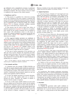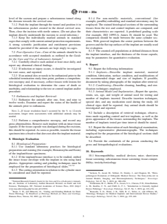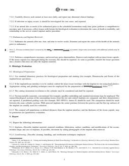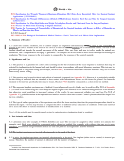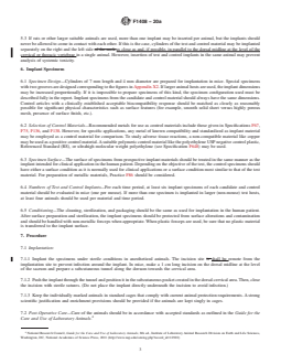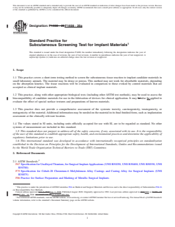 SIGNIFICANCE AND USE 4.1 This practice is a guideline for a short-term screening test for the evaluation of the tissue response to materials that may be selected for implantation in the human body and should be done in accordance with good laboratory practices. This test may be performed prior to long-term testing (for example, Practice F981) to eliminate unsuitable candidate materials early and to avoid unnecessary animal testing. 4.2 This practice may be used to detect toxic effects of materials in general (see Appendix X1). However, it is particularly suitable for the testing of materials that are intended to have contact with subcutaneous tissues or soft tissues in general. For materials intended to be inserted specifically into muscle tissues, Practice F763 should be considered as a short-term test method. 4.3 The suggested implant specimens are cylindrical. A special grooved type of cylinder may be used (see Fig. X2.1 of Appendix X2) to allow tissue interlocking that could keep the implant in place and minimize tissue irritation through motion at the interface that otherwise could contribute to increased variance of the results. In case ungrooved cylinders are used (see Fig. X1.2 of Appendix X2), probable motion at the implant/tissue interface must be taken into account. Control cylinders should be shaped like the test cylinders. 4.4 The type of surface preparation of the specimens can affect the tissue reaction; therefore the preparation procedure should be noted in the report. The test may be used to compare the effect of different surface structures or conditions of the same material or to assess the effect of various treatments of modifications of a material. Note 1: If this method is used for material research, testing for endotoxin prior to implantation should be considered. SCOPE 1.1 This practice covers a short-term testing method to screen the subcutaneous tissue reaction to implant candidate materials in small laboratory animals. The material may be dense or porous. This method may not work for absorbable materials, depending on the absorption kinetics. The tissue reactions will be evaluated in comparison to those evoked by control materials that are accepted as clinical implant materials. 1.2 This practice, along with other appropriate biological tests (including other ASTM test methods), may be used to assess the biocompatibility of candidate materials for use in the fabrication of devices for clinical application. It may also be applied to evaluate the effect of special surface textures and preparations of known materials. 1.3 This practice does not provide a comprehensive assessment of the systemic toxicity, carcinogenicity, teratogenicity, or mutagenicity of the material. Additional information may be needed on the material in its final finished form, such as implantation assessment at the clinically relevant location. 1.4 The values stated in SI units, including units officially accepted for use with SI, are to be regarded as standard. No other systems of measurement are included in this standard. 1.5 This standard does not purport to address all of the safety concerns, if any, associated with its use. It is the responsibility of the user of this standard to establish appropriate safety, health, and environmental practices and determine the applicability of regulatory limitations prior to use. 1.6 This international standard was developed in accordance with internationally recognized principles on standardization established in the Decision on Principles for the Development of International Standards, Guides and Recommendations issued by the World Trade Organization Technical Barriers to Trade (TBT) Committee.