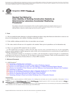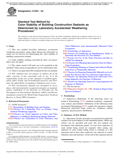 SIGNIFICANCE AND USE 5.1 This test method is intended to induce color changes in sealants, as well as their constituent pigments, associated with end-use conditions, including the effects of sunlight, moisture, and heat. The exposures used in this test method are not intended to simulate the color change of a sealant caused by localized weathering phenomena, such as atmospheric pollution, biological attack, or saltwater exposure. 5.2 When conducting exposures in devices that use laboratory light sources, it is important to consider how well the artificial test conditions will reproduce property changes and failure modes associated with end-use environments for the sealant being tested. Information on the use and interpretation of data from accelerated exposure tests is provided in Practice G151. 5.3 When this test method is used as part of a specification, exact procedure, test conditions, test duration and evaluation technique must be specified. Results obtained between the two procedures may vary, because the spectral power distribution of the light sources (fluorescent UV and xenon arc) differ. Sealants should not be compared to each other based on the results obtained in different types of apparatus. 5.4 These devices are capable of matching ultraviolet solar radiation reasonably well. However, for sealants sensitive to long wavelength UV and visible solar radiation, the absence of this radiation in the fluorescent UV apparatus can distort color stability ranking when compared to exterior environment exposure. Note 1: Refer to Practice G151 for full cautionary guidance regarding laboratory weathering of non-metallic materials. SCOPE 1.1 This test method describes laboratory accelerated weathering procedures using either fluorescent ultraviolet or xenon arc test devices for determining the color stability of building construction sealants. 1.2 Color stability rankings provided by these two procedures may not agree. 1.3 The values stated in SI units are to be regarded as the standard. Values given in parentheses are for information only. 1.4 There is no equivalent ISO standard for this test method. 1.5 This standard does not purport to address all of the safety concerns, if any, associated with its use. It is the responsibility of the user of this standard to establish appropriate safety, health, and environmental practices and determine the applicability of regulatory limitations prior to use. 1.6 This international standard was developed in accordance with internationally recognized principles on standardization established in the Decision on Principles for the Development of International Standards, Guides and Recommendations issued by the World Trade Organization Technical Barriers to Trade (TBT) Committee.