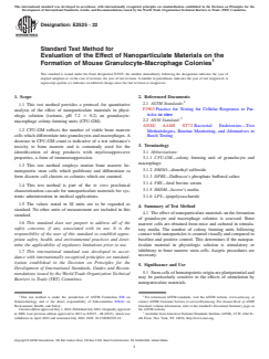 ASTM E2525-22 is a standard published by ASTM International. Its full title is "Standard Test Method for Evaluation of the Effect of Nanoparticulate Materials on the Formation of Mouse Granulocyte-Macrophage Colonies". This standard covers: SIGNIFICANCE AND USE 5.1 Stem cells of hematopoietic origin are pluripotential and may be particularly sensitive to the effects of stimulation by nanoparticulate materials. 5.2 The effect of particles on macrophage responses has an extensive history and can be assessed by Practice F1903. The test method described here will assess the effect on stem cells which can be progenitor cells to the macrophage line. SCOPE 1.1 This test method provides a protocol for quantitative analysis of the effect of nanoparticulate materials in physiologic solution (isotonic, pH 7.2 ± 0.2) on granulocyte-macrophage colony-forming units (CFU-GM). 1.2 CFU-GM reflects the number of viable bone marrow cells which differentiate into granulocytes and macrophages. A decrease in CFU-GM count is indicative of a test substance’s toxicity to bone marrow and is commonly used for the identification of drug products with myelosuppressive properties, a form of immunosuppression. 1.3 This test method employs murine bone marrow hematopoietic stem cells which proliferate and differentiate to form discrete cell clusters or colonies which are counted. 1.4 This test method is part of the in vitro preclinical characterization cascade for nanoparticulate materials for systemic administration in medical applications. 1.5 The values stated in SI units are to be regarded as standard. No other units of measurement are included in this standard. 1.6 This standard does not purport to address all of the safety concerns, if any, associated with its use. It is the responsibility of the user of this standard to establish appropriate safety, health, and environmental practices and determine the applicability of regulatory limitations prior to use. 1.7 This international standard was developed in accordance with internationally recognized principles on standardization established in the Decision on Principles for the Development of International Standards, Guides and Recommendations issued by the World Trade Organization Technical Barriers to Trade (TBT) Committee.