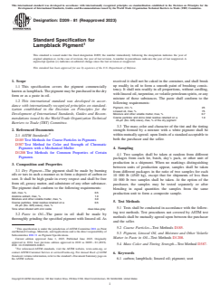 ASTM D209-81(2023), published by ASTM International, is the standard specification for lampblack pigment. Lampblack is a carbon-based pigment produced by burning oils or tars, available either as a dry powder or as a paste in oil. This standard offers detailed requirements for both forms, ensuring consistent quality and performance across applications. The specification establishes essential criteria for chemical composition, physical properties, sampling, and testing of lampblack pigment, which is widely used in coatings, paints, inks, and related industries.