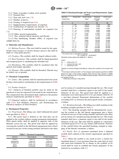 ABSTRACT This specification covers the chemical, mechanical, grain size, and dimensional requirements for weldless forged, quenched, and tempered carbon steel threaded lifting eyes (formerly pertained to as eyebolts) for overhead lifting. This specification covers two types denoting shank pattern, and one style denoting shank length, as follows: Type 1, plain pattern (straight shank); Type 2, shoulder pattern; and Style B, short length. The lifting eyes shall be manufactured as specified for the melting, forging, heat treatment, and machining processes. The mechanical properties to which the lifting eyes shall adhere are proof, breaking strength, tensile stress and strength, bend strength, impact strength, yield point, elongation, and reduction of area. SCOPE 1.1 This specification covers chemical, physical and mechanical requirements for forged, carbon steel threaded eyebolts intended for overhead lifting. 1.2 The specification includes two types denoting shank pattern and two styles denoting shank length (both defined in ASME B 18.15) as follows: 1.2.1 Type 1—Plain pattern (straight shank). 1.2.2 Type 2—Shoulder pattern. 1.2.3 Style A—Long length. 1.2.4 Style B—Short length. 1.3 The values stated in inch-pound units are to be regarded as standard. No other units of measurement are included in this standard. 1.4 The terms used in this specification are defined in Terminology F1789 unless otherwise defined herein. 1.5 The following safety hazard caveat pertains to the test methods portion of this specification: This standard does not purport to address all of the safety concerns, if any, associated with its use. It is the responsibility of the user of this standard to establish appropriate safety, health, and environmental practices and determine the applicability of regulatory limitations prior to use. 1.6 This international standard was developed in accordance with internationally recognized principles on standardization established in the Decision on Principles for the Development of International Standards, Guides and Recommendations issued by the World Trade Organization Technical Barriers to Trade (TBT) Committee.