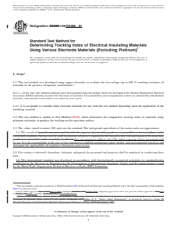 SIGNIFICANCE AND USE 5.1 Electrical equipment has the potential to fail as a result of electrical tracking of insulating material that is exposed to various contaminating environments and surface conditions. A number of ASTM and other tests have been designed to quantify behavior of materials, especially at relatively high voltages. This method is an accelerated test which, at relatively low test voltages, provides a comparison of the performance of insulating materials under wet and contaminated conditions. The Tracking Index-Copper Electrodes test is not related directly to the suitable operating voltage in service. 5.2 When organic electrical insulating materials are subjected to conduction currents between electrodes on their surfaces, many minute tree-like carbonaceous paths or tracks are developed near the electrodes. These tracks are oriented randomly, but generally propagate between the electrodes under the influence of the applied potential difference. Eventually a series of tracks spans the electrode gap, and failure occurs by shorting of the electrodes. 5.3 As in other tracking test methods, for example, IEC 60112 and Test Method D3638, this test method specifies test procedures that are intended to promote the formation of surface discharges which will produce carbon tracks in a reproducible manner. Since these conditions rarely reproduce the actual conditions encountered in service, the results of tracking tests cannot be used to infer either direct or relative service behavior of a material in a specific design application. Tracking tests can be used for screening purposes only. Suitability is verified through testing of the material in actual end use or under conditions that closely simulate actual end use. 5.4 The use of copper electrodes in this type of test was developed at the University of Cincinnati, NEMA laboratory. It is felt by the members of the Industrial Laminates Section of NEMA that using copper electrodes gives a more realistic value for a tracking... SCOPE 1.1 This test method was developed using copper electrodes to evaluate the low-voltage (up to 600 V) tracking resistance of materials in the presence of aqueous contaminants.2 Note 1: At this time, only industrial laminates have been examined using this method, which was developed at the National Manufacturers Electrical Association (NEMA) laboratory located at the University of Cincinnati. It was found that a closer end point (less scatter) was obtained than with platinum electrodes, and materials tested tended to be ranked by resin system. 1.1.1 It is acceptable to consider other electrode materials for use with this test method depending upon the application of the insulating material. 1.2 This test method is similar to Test Method D3638, which determines the comparative tracking index of materials using platinum electrodes to produce the tracking on the specimen surface. 1.3 The values stated in metric (SI) units are the standard. The inch-pound equivalents of the metric units are approximate. 1.4 This standard does not purport to address all of the safety concerns, if any, associated with its use. It is the responsibility of the user of this standard to establish appropriate safety, health, and environmental practices and determine the applicability of regulatory limitations prior to use. 1.5 Fire testing is inherently hazardous. Adequate safeguards for personnel and property shall be employed in conducting these tests. 1.6 This international standard was developed in accordance with internationally recognized principles on standardization established in the Decision on Principles for the Development of International Standards, Guides and Recommendations issued by the World Trade Organization Technical Barriers to Trade (TBT) Committee.