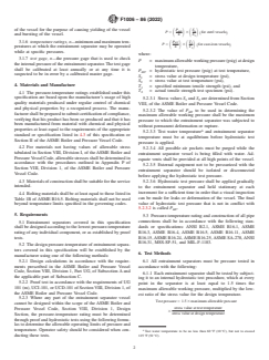 ABSTRACT This specification covers the minimum requirements for the pressure-temperature rating, testing, and making of pressure-containing vessels for entrainment separators. Entrainment separators covered in this specification shall be designed according to the lowest pressure-temperature rating of any individual component, or as established by proof tests. Test water temperature and entrainment separator temperature must be at equilibrium before hydrostatic test pressure is applied. All possible air pockets must be purged while the entrainment separator vessel is being filled with water. External equipment not to be pressurized with the entrainment separator should be isolated or disconnected before applying the hydrostatic test pressure. Hydrostatic test pressure shall be applied gradually to the entrainment separator and held stationary at each increment for a sufficient time in order that a visual inspection can be made for leaks or deformation of the vessel. SCOPE 1.1 This specification covers the minimum requirements for the pressure-temperature rating, testing, and making of pressure-containing vessels for entrainment separators. 1.2 The values stated in inch-pound units are to be regarded as standard. The values given in parentheses are mathematical conversions to SI units that are provided for information only and are not considered standard. 1.3 The following safety hazards caveat pertains only to the test methods portion, Section 6, of this specification: This standard does not purport to address all of the safety concerns, if any, associated with its use. It is the responsibility of the user of this standard to establish appropriate safety, health, and environmental practices and determine the applicability of regulatory limitations prior to use. 1.4 This international standard was developed in accordance with internationally recognized principles on standardization established in the Decision on Principles for the Development of International Standards, Guides and Recommendations issued by the World Trade Organization Technical Barriers to Trade (TBT) Committee.