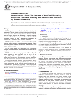 ASTM D7089-06(2021) is a standard published by ASTM International. Its full title is "Standard Practice for Determination of the Effectiveness of Anti-Graffiti Coating for Use on Concrete, Masonry and Natural Stone Surfaces by Pressure Washing". This standard covers: SIGNIFICANCE AND USE 5.1 Graffiti on buildings and structures is a significant problem in various regions across the country. A variety of coatings have been developed to be either resistant to the application of paints/marker or to aid in their removal. This standard practice describes a procedure for evaluating the effectiveness of anti-graffiti coatings applied to various concrete, masonry and natural stone substrates. It does not address graffiti removal on metal or any other non-mineral substrate. 5.2 This practice only addresses graffiti removal on substrates in a laboratory environment, that have not been exposed to either natural or artificial weathering. Specification D6578 describes a method for graffiti removal after both natural and artificial weathering. SCOPE 1.1 This practice covers a basic method for evaluating the performance of anti-graffiti products on mineral building substrates by a series of increasingly abrasive cleaning methods. The anti-graffiti materials are applied to a series of concrete, masonry and natural stone specimens for evaluation. Graffiti resistance is based on how a defined set of markings are removed by a designated set of cleaning techniques. 1.2 This practice also defines a procedure to evaluate graffiti removal after re-marking with subsequent re-cleaning. It does not address the re-treatment of substrates after a material is no longer graffiti resistant. 1.3 The values stated in SI units are to be regarded as standard. No other units of measurement are included in this standard. 1.4 This standard does not purport to address all of the safety concerns, if any, associated with its use. It is the responsibility of the user of this standard to establish appropriate safety, health, and environmental practices and determine the applicability of regulatory limitations prior to use. 1.5 This international standard was developed in accordance with internationally recognized principles on standardization established in the Decision on Principles for the Development of International Standards, Guides and Recommendations issued by the World Trade Organization Technical Barriers to Trade (TBT) Committee.