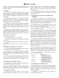 1.2 This practice also defines a procedure to evaluate graffiti removal after re-marking with subsequent re-cleaning. It does not address the re-treatment of substrates after a material is no longer graffiti resistant.