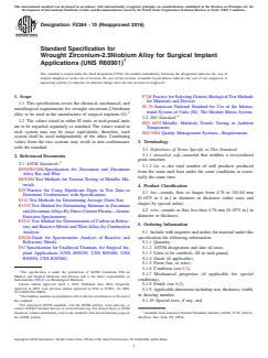 ABSTRACT This specification covers the requirements fro wrought zirconium-2.5niobium alloy for use in surgical implant applications. The material shall be manufactured into bars or wires by multiple vacuum melting in arc furnaces, by electron beam melting, or by other melting processes conventionally used for reactive metals. The material shall be in the annealed condition, with the surface descaled or pickled, abrasively blasted, chemically milled, ground, machined, peeled, or polished. Heat and product analyses and tests for tensile strength, yield strength, and elongation shall be performed and shall conform to the requirements specified. In addition, the material shall have a microstructure consisting of a fine dispersion of the alpha and beta phases as a result of processing in the alpha plus beta field, with no coarse, elongated alpha platelets. SCOPE 1.1 This specification covers the chemical, mechanical, and metallurgical requirements for wrought zirconium-2.5niobium alloy to be used in the manufacture of surgical implants (1).2 1.2 The values stated in either SI units or inch-pound units are to be regarded separately as standard. The values stated in each system may not be exact equivalents; therefore, each system shall be used independently of the other. Combining values from the two systems may result in non-conformance with the standard.
