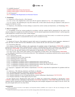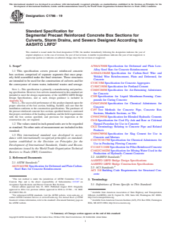 ASTM C1786-19 is a technical specification published by ASTM International. Its full title is "Standard Specification for Segmental Precast Reinforced Concrete Box Sections for Culverts, Storm Drains, and Sewers Designed According to AASHTO LRFD". This standard covers: ABSTRACT This specification covers precast reinforced concrete box sections comprised of separate segments that once properly field assembled make the final structure. These structures are intended to be used for the construction of culverts and for the conveyance of storm water, industrial wastes, and sewage. This specification provides requirements for the acceptability of the box sections, material and manufacture, design, reinforcement, joints, repairs, inspection, and product marking. SCOPE 1.1 This specification covers precast reinforced concrete box sections comprised of separate segments that once properly field assembled make the final structure. These structures are intended to be used for the construction of culverts and for the conveyance of storm water, industrial wastes and sewage. Note 1: This specification is primarily a manufacturing and purchasing specification. However, box culverts manufactured to this standard are intended to meet the design requirements of the AASHTO LRFD Bridge Design Specifications, and as such, design guidance is included in Appendix X1. Note 2: The successful performance of this product depends upon the proper selection of the box section, bedding, backfill, and care that the installation conforms to the construction specifications. The purchaser of the precast reinforced concrete box sections specified herein is cautioned that proper correlation of the loading conditions and the field requirements with the box section specified, and provision for inspection at the construction site, are required. 1.2 The values stated in inch-pound units are to be regarded as standard. No other units of measurement are included in this standard. 1.3 This international standard was developed in accordance with internationally recognized principles on standardization established in the Decision on Principles for the Development of International Standards, Guides and Recommendations issued by the World Trade Organization Technical Barriers to Trade (TBT) Committee.