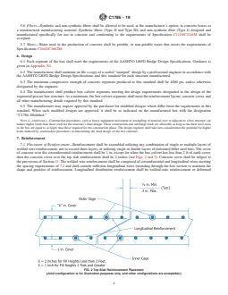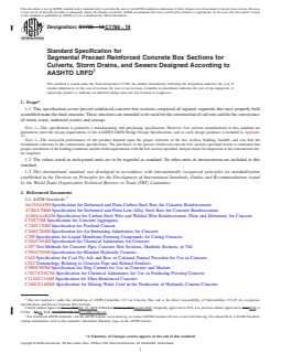 ABSTRACT This specification covers precast reinforced concrete box sections comprised of separate segments that once properly field assembled make the final structure. These structures are intended to be used for the construction of culverts and for the conveyance of storm water, industrial wastes, and sewage. This specification provides requirements for the acceptability of the box sections, material and manufacture, design, reinforcement, joints, repairs, inspection, and product marking. SCOPE 1.1 This specification covers precast reinforced concrete box sections comprised of separate segments that once properly field assembled make the final structure. These structures are intended to be used for the construction of culverts and for the conveyance of storm water, industrial wastes and sewage. Note 1: This specification is primarily a manufacturing and purchasing specification. However, box culverts manufactured to this standard are intended to meet the design requirements of the AASHTO LRFD Bridge Design Specifications, and as such, design guidance is included in Appendix X1. Note 2: The successful performance of this product depends upon the proper selection of the box section, bedding, backfill, and care that the installation conforms to the construction specifications. The purchaser of the precast reinforced concrete box sections specified herein is cautioned that proper correlation of the loading conditions and the field requirements with the box section specified, and provision for inspection at the construction site, are required. 1.2 The values stated in inch-pound units are to be regarded as standard. No other units of measurement are included in this standard. 1.3 This international standard was developed in accordance with internationally recognized principles on standardization established in the Decision on Principles for the Development of International Standards, Guides and Recommendations issued by the World Trade Organization Technical Barriers to Trade (TBT) Committee.