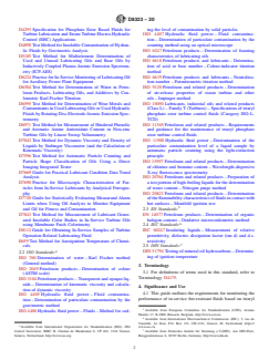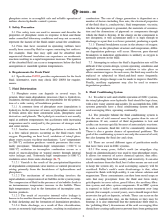 SIGNIFICANCE AND USE 4.1 This guide outlines the requirements for monitoring the performance of in-service fire-resistant fluids based on triaryl phosphate esters to accomplish safe and reliable operation of turbine electro-hydraulic control systems. SCOPE 1.1 This guide provides recommendations to achieve safe and reliable operation of EHC systems, recommended levels for required corrective action, and suggested management practices. 1.2 The recommended set of physical and chemical properties of triaryl phosphate esters and their limits have been selected based on past operating experience with various fluids (primarily xylylated and butylated triaryl phosphate esters) used in different EHC system designs under different operating and environmental conditions. 1.3 This guide is not intended to replace Original Equipment Manufacturer (OEM) specifications but rather support users experiencing operating problems by recommending limits based on existing knowledge of triaryl phosphate ester degradation mechanisms. This guide should be used outside the warranty period or in cases where no OEM standard exists or is available. 1.4 The values stated in SI units are to be regarded as standard. No other units of measurement are included in this standard. 1.5 This standard does not purport to address all of the safety concerns, if any, associated with its use. It is the responsibility of the user of this standard to establish appropriate safety, health, and environmental practices and determine the applicability of regulatory limitations prior to use. 1.6 This international standard was developed in accordance with internationally recognized principles on standardization established in the Decision on Principles for the Development of International Standards, Guides and Recommendations issued by the World Trade Organization Technical Barriers to Trade (TBT) Committee.