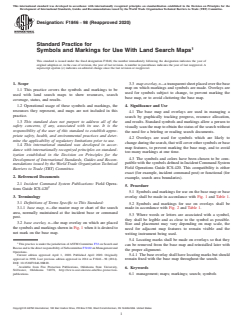 ASTM F1846-98(2020) is a standard published by ASTM International. Its full title is "Standard Practice for Symbols and Markings for Use With Land Search Maps". This standard covers: SIGNIFICANCE AND USE 4.1 The base map and overlays are used in managing a search by graphically tracking progress, resource allocation, and results. Standard symbols and markings allow a person to visually scan the map to obtain the status of the search without the need for a briefing or reading search documents. 4.2 Overlays are used for symbols which are likely to change during the search, that will cover other symbols or base map features, to prevent marking the base map, and to avoid too many markings at one time. 4.3 The symbols and colors have been chosen to be compatible with the symbols defined in Incident Command System Field Operations Guide ICS-420. This compatibility is either exact (for example, incident command post) or functional (for example, search area boundaries). SCOPE 1.1 This practice covers the symbols and markings to be used with land search maps to show resources, search coverage, status, and results. 1.2 Operational usage of these symbols and markings, the resources they represent, and maps are not included in this practice. 1.3 This standard does not purport to address all of the safety concerns, if any, associated with its use. It is the responsibility of the user of this standard to establish appropriate safety, health, and environmental practices and determine the applicability of regulatory limitations prior to use. 1.4 This international standard was developed in accordance with internationally recognized principles on standardization established in the Decision on Principles for the Development of International Standards, Guides and Recommendations issued by the World Trade Organization Technical Barriers to Trade (TBT) Committee.