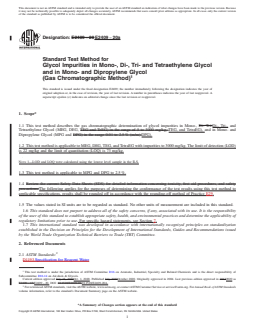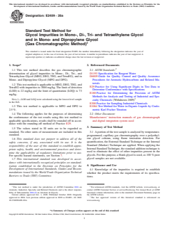 Keywords: ASTM E2409-20a, glycol impurities, MEG, DEG, TEG, TetraEG, MPG, DPG, gas chromatographic method, chemical analysis, quality control, industrial chemicals, impurity detection, product specification, laboratory testing