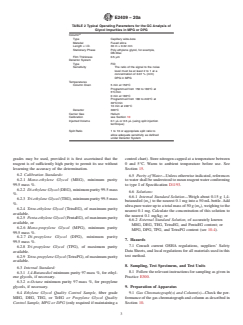 SIGNIFICANCE AND USE 4.1 Knowledge of the impurities is required to establish whether the product meets the requirements of its specifications. SCOPE 1.1 This test method describes the gas chromatographic determination of glycol impurities in Mono-, Di-, Tri-, and Tetraethylene Glycol (MEG, DEG, TEG, and TetraEG), and in Mono- and Dipropylene Glycol (MPG and DPG). 1.2 This test method is applicable to MEG, DEG, TEG, and TetraEG with impurities to 3000 mg/kg. The limit of detection (LOD) is 22 mg/kg and the limit of quantitation (LOQ) is 73 mg/kg. Note 1: LOD and LOQ were calculated using the lowest level sample in the ILS. 1.3 This test method is applicable to MPG and DPG to 2.5 %. 1.4 The following applies for the purposes of determining the conformance of the test results using this test method to applicable specifications, results shall be rounded off in accordance with the rounding-off method of Practice E29. 1.5 The values stated in SI units are to be regarded as standard. No other units of measurement are included in this standard. 1.6 This standard does not purport to address all of the safety concerns, if any, associated with its use. It is the responsibility of the user of this standard to establish appropriate safety, health, and environmental practices and determine the applicability of regulatory limitations prior to use. For specific hazard statements, see Section 7. 1.7 This international standard was developed in accordance with internationally recognized principles on standardization established in the Decision on Principles for the Development of International Standards, Guides and Recommendations issued by the World Trade Organization Technical Barriers to Trade (TBT) Committee.