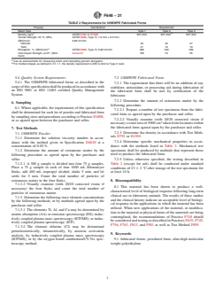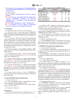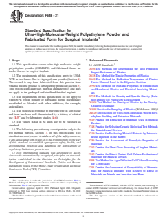 ASTM F648-21 is a technical specification published by ASTM International. Its full title is "Standard Specification for Ultra-High-Molecular-Weight Polyethylene Powder and Fabricated Form for Surgical Implants". This standard covers: ABSTRACT This specification covers ultra-high-molecular-weight polyethylene (UHMWPE) powder and fabricated forms for use in surgical implants. UHMWPE powder shall be of virgin polymer manufactured from a homopolymer of ethylene, while the fabricated forms shall be manufactured from the same UHMWPE powder without any stabilizers or processing aids. Tests for viscosity number, elongation stress, ash content, extraneous matter, and trace elements shall be performed for UHMWPE powders, while tests for density, ash content, tensile strength, yield strength, elongation, and impact strength shall be performed for fabricated forms. All tests shall conform to the requirements specified. SCOPE 1.1 This specification covers ultra-high molecular weight polyethylene powder (UHMWPE) and fabricated forms intended for use in surgical implants. 1.2 The requirements of this specification apply to UHMWPE in two forms. One is virgin polymer powder (Section 4). The second is any form fabricated from this powder from which a finished product is subsequently produced (Section 5). This specification addresses material characteristics and does not apply to the packaged and sterilized finished implant. 1.3 The requirements of this specification do not apply to UHMWPE virgin powder or fabricated forms intentionally crosslinked or blended with other additives, for example, antioxidants. 1.4 The biological response to polyethylene in soft tissue and bone has been well characterized by a history of clinical use (1-3)2 and by laboratory studies (4-6). 1.5 The values stated in SI units are to be regarded as standard. 1.6 The following precautionary caveat pertains only to the test method portion, Section 7, of this specification: This standard does not purport to address all of the safety concerns, if any, associated with its use. It is the responsibility of the user of this standard to establish appropriate safety, health, and environmental practices and determine the applicability of regulatory limitations prior to use. 1.7 This international standard was developed in accordance with internationally recognized principles on standardization established in the Decision on Principles for the Development of International Standards, Guides and Recommendations issued by the World Trade Organization Technical Barriers to Trade (TBT) Committee.
