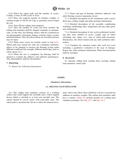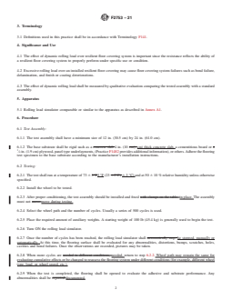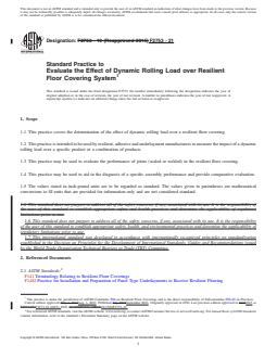 SIGNIFICANCE AND USE 4.1 The effect of dynamic rolling load over resilient floor covering system is important since the resistance reflects the ability of a resilient floor covering system to properly perform under specific use or condition. 4.2 Excessive rolling load over an installed resilient floor covering may cause floor covering system failures such as bond failure, delamination, and finish or coating deteriorations. 4.3 The effect of dynamic rolling load shall be measured by qualitative evaluation comparing the tested assembly with a standard assembly. SCOPE 1.1 This practice covers the determination of the effect of dynamic rolling load over a resilient floor covering. 1.2 This practice is intended to be used by resilient, adhesive and underlayment manufacturers to measure the impact of a dynamic rolling load over a specific product or a combination of products. 1.3 This practice may be used to evaluate the performance of joints (sealed or welded) in the resilient floor covering. 1.4 This practice may be used to aid in the diagnosis of a specific assembly performance and provide comparative evaluation. 1.5 The values stated in inch-pound units are to be regarded as standard. The values given in parentheses are mathematical conversions to SI units that are provided for information only and are not considered standard. 1.6 This standard does not purport to address all of the safety concerns, if any, associated with its use. It is the responsibility of the user of this standard to establish appropriate safety, health, and environmental practices and determine the applicability of regulatory limitations prior to use. 1.7 This international standard was developed in accordance with internationally recognized principles on standardization established in the Decision on Principles for the Development of International Standards, Guides and Recommendations issued by the World Trade Organization Technical Barriers to Trade (TBT) Committee.