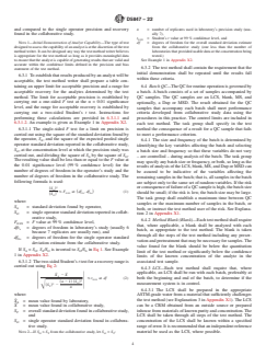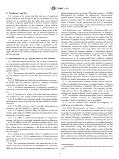SIGNIFICANCE AND USE 5.1 In order to be certain that the end user of analytical results obtained from using an ASTM Committee D19 test method can be confident that the values have been obtained through a competent application of the test method, a demonstration of the proficiency of the analytical system shall be performed. Appropriate proficiency is demonstrated by achievement of performance criteria derived from results of the test method collaborative study. The QC measures specified in this practice shall be included in each ASTM test method, as applicable, to ensure the quality of measurements. 5.2 In order for users of D19 test methods to achieve consistently valid results, a minimum level of QC shall be performed. This minimum level of QC is stipulated in this practice and by the task groups developing D19 test methods. If the specific requirements outlined in this practice are not applicable to the test method, alternative QC shall be defined in the test method. SCOPE 1.1 This practice provides specific, mandatory requirements for incorporating quality control (QC) procedures into all test methods under the jurisdiction of Committee D19. 1.2 ASTM International has adopted the following: Policy on implementation of requirements for a quality control section in standard test methods generated by Committee D19 on Water. GENERAL—By July 29, 1998, or at the next reapproval or revision, whichever is later, every D19 Standard Test Method shall contain a QC section that is in full compliance with the requirements of this practice. NEW COLLABORATIVE TESTING—As of July 29, 1998, each collaborative study design shall include a QC section as part of the method to be tested. Prior to approval of the study design, the Results Advisor or equivalent shall ascertain the appropriateness of the QC section in meeting the requirements of this practice and Practice D2777, and shall advise the designer of the study of any changes needed to fulfill the requirements of these practices. Before a collaborative study may be conducted, approval of the study design by the Results Advisor or equivalent shall be obtained. OLDER VALIDATED METHODS—Standard test methods that were validated using Practices D2777 – 77, D2777 – 86, or D2777 – 94, when balloted for reapproval or revision, shall contain a QC section based upon the best information from the historical record. Where appropriate, information derived from the record of the collaborative study shall be utilized for this purpose. The introduction of the QC section into these standard test methods shall not be construed as a requirement for a new collaborative study, though the Subcommittee may opt for such a study. Any information available regarding QC or precision/bias testing shall be included in the appropriate sections of the published test method. 1.3 Required QC sections in all applicable test methods are intended to achieve two goals. First, users of Committee D19 test methods will be able to demonstrate a minimum competency in the performance of these test methods by comparison with collaborative study data. Second, all users of test methods will be required to perform a minimum level of QC as part of proper implementation of these test methods to ensure ongoing competency. 1.4 This practice contains the primary requirements for QC of a specific test method. In many cases, it may be desirable to implement additional QC requirements to assure the desired quality of data. 1.5 The specific requirements in this practice may not be applicable to all test methods. These requirements may vary depending on the type of test method used as well as the analyte being determined and the sample matrix being analyzed. 1.5.1 If there are compelling reasons why any of the specific QC requirements listed in this practice are not applicable to a specific test method, these reaso...
