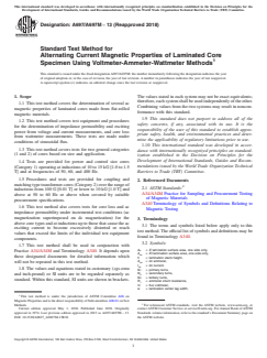 SIGNIFICANCE AND USE 5.1 This test method was developed for evaluating the ac magnetic properties of laminated cores made from flat-rolled magnetic materials. 5.2 The reproducibility and repeatability of this test method are such that this test method is suitable for design, specification acceptance, service evaluation, and research and development. SCOPE 1.1 This test method covers the determination of several ac magnetic properties of laminated cores made from flat-rolled magnetic materials. 1.2 This test method covers test equipment and procedures for the determination of impedance permeability and exciting power from voltage and current measurements, and core loss from wattmeter measurements. These tests are made under conditions of sinusoidal flux. 1.3 This test method covers tests for two general categories (1 and 2) of cores based on size and application. 1.4 Tests are provided for power and control size cores (Category 1) operating at inductions of 10 to 15 kG [1.0 to 1.5 T] and at frequencies of 50, 60, and 400 Hz. 1.5 Procedures and tests are provided for coupling and matching type transformer cores (Category 2) over the range of inductions from 100 G [0.01 T] or lower to 10 kG [1.0 T] and above at 50 to 60 Hz or above when covered by suitable procurement specifications. 1.6 This test method also covers tests for core loss and ac impedance permeability under incremental test conditions (ac magnetization superimposed on dc magnetization) for the above core types and at inductions up to those that cause the ac exciting current to become excessively distorted or reach values that exceed the limits of the individual test equipment components. 1.7 This test method shall be used in conjunction with Practice A34/A34M and Terminology A340. It depends upon these designated documents for detailed information which will not be repeated in this test method. 1.8 The values and equations stated in customary (cgs-emu and inch-pound) or SI units are to be regarded separately as standard. Within this standard, SI units are shown in brackets. The values stated in each system may not be exact equivalents; therefore, each system shall be used independently of the other. Combining values from the two systems may result in nonconformance with this standard. 1.9 This standard does not purport to address all of the safety concerns, if any, associated with its use. It is the responsibility of the user of this standard to establish appropriate safety, health, and environmental practices and determine the applicability of regulatory limitations prior to use. 1.10 This international standard was developed in accordance with internationally recognized principles on standardization established in the Decision on Principles for the Development of International Standards, Guides and Recommendations issued by the World Trade Organization Technical Barriers to Trade (TBT) Committee.