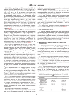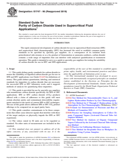 ABSTRACT This guide defines purity standards for carbon dioxide to ensure the suitability of liquefied carbon dioxide gas for use in supercritical fluid extraction (SFE) and supercritical fluid chromatography (SFC) applications. This guide defines quantitation, labeling, and statistical standards for impurities in carbon dioxide that are necessary for successful SFE or SFC laboratory work, and it suggests methods of analysis for quantifying these impurities. These contaminants are those components that either cause detector signals that interfere with those of the target analytes or physically impede the SFE or SFC experiment. Also, this guide is provided for use by specialty gas suppliers who manufacture carbon dioxide specifically for SFE or SFC applications. SFE or SFC CO2 products offered with a claim of adherence to this guide will meet certain absolute purity and contaminant detectability requirements matched to the needs of current SFE or SFC techniques. SCOPE 1.1 This guide defines purity standards for carbon dioxide to ensure the suitability of liquefied carbon dioxide gas for use in SFE and SFC applications (see Guide E1449 for definitions of terms). This guide defines quantitation, labeling, and statistical standards for impurities in carbon dioxide that are necessary for successful SFE or SFC laboratory work, and it suggests methods of analysis for quantifying these impurities. 1.2 This guide is provided for use by specialty gas suppliers who manufacture carbon dioxide specifically for SFE or SFC applications. SFE or SFC carbon dioxide (CO2) products offered with a claim of adherence to this guide will meet certain absolute purity and contaminant detectability requirements matched to the needs of current SFE or SFC techniques. The use of this guide allows different SFE or SFC CO2 product offerings to be compared on an equal purity basis. 1.3 This guide considers contaminants to be those components that either cause detector signals that interfere with those of the target analytes or physically impede the SFE or SFC experiment. 1.4 The values stated in SI units are to be regarded as standard. No other units of measurement are included in this standard. 1.5 This standard does not purport to address all of the safety concerns, if any, associated with its use. It is the responsibility of the user of this standard to establish appropriate safety, health, and environmental practices and determine the applicability of limitations prior to use. 1.6 This international standard was developed in accordance with internationally recognized principles on standardization established in the Decision on Principles for the Development of International Standards, Guides and Recommendations issued by the World Trade Organization Technical Barriers to Trade (TBT) Committee.