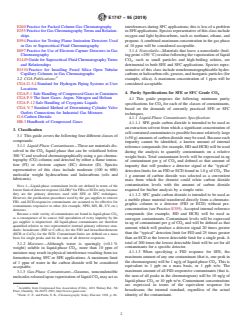 1.2 This guide is provided for use by specialty gas suppliers who manufacture carbon dioxide specifically for SFE or SFC applications. SFE or SFC carbon dioxide (CO2) products offered with a claim of adherence to this guide will meet certain absolute purity and contaminant detectability requirements matched to the needs of current SFE or SFC techniques. The use of this guide allows different SFE or SFC CO2 product offerings to be compared on an equal purity basis.