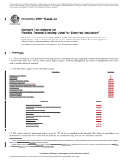 ASTM D350-21 provides standardized test methods for evaluating flexible treated sleeving used for electrical insulation. Developed by ASTM International, this standard guides manufacturers, laboratories, and quality control personnel in testing various properties of flexible tubular sleeving made from textile fiber bases - such as cotton, rayon, nylon, or glass - that have been impregnated and/or coated with dielectric materials. These test methods are crucial for assessing physical, electrical, thermal, and chemical properties, ensuring reliable performance in electrical insulation applications.