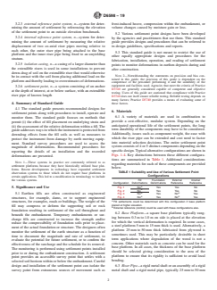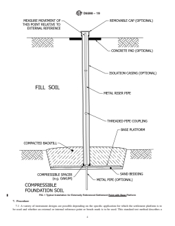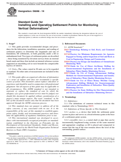 SIGNIFICANCE AND USE 5.1 Earthen fills are often constructed as engineered structures, for example, dams, or to support engineered structures, for examples, roads or buildings. The weight of the fill may compress or deform the supporting soil or rock foundation resulting in settlement of the soil throughout and beneath the embankment. Temporary embankments or surcharge fills are constructed to increase the strength and/or reduce the compressibility of foundation soils prior to placement of the actual foundation or structure. The designers often monitor the settlement of the earth structure as a function of time to document the magnitude and rate of settlement, to evaluate the potential for future settlement, or to confirm the effectiveness of the surcharge and the schedule for its removal. The monitoring is performed using settlement points installed prior to or during the embankment construction. A settlement point provides an accessible survey point that settles with a selected soil horizon within or below the embankment. Careful design and installation of the settlement point can isolate the survey point from extraneous sources of movement such as frost-induced heave, compression within the embankment, or volume changes caused by moisture gain or loss. 5.2 Various settlement point designs have been developed by the agencies and practitioners that use them. This standard guide provides designs and procedures that can be referred to in design guidelines, specifications and reports. 5.3 This standard guide is not meant to restrict the use of other equally appropriate designs and procedures for the fabrication, installation, operation, and reading of settlement points to monitor deformations in earthen deposits during and after construction. Note 2: Notwithstanding the statements on precision and bias contained in this guide, the precision of this guide is dependent on the competence of the personnel performing it and the suitability of the equipment and facilities used. Agencie... SCOPE 1.1 This guide provides recommended designs and procedures for the fabrication, installation, operation, and reading of settlement point(s) to determine the magnitude and rate of foundation, fill settlements, or both generally under a fill or embankment load. Two types of settlement points are described – those being monitored by elevation surveys from an external bench mark and those that include an internal reference system supported on unyielding soil or rock beneath the compressible layer(s) of interest. 1.2 Units—The values stated in SI units are to be regarded as standard. No other units of measurement are included in this standard. 1.3 This guide offers an organized collection of information or a series of options and does not recommend a specific course of action. This document cannot replace education or experience and should be used in conjunction with professional judgement. Not all aspects of this guide may be applicable in all circumstances. This ASTM standard is not intended to represent or replace the standard of care by which the adequacy of a given professional service must be judged, nor should this document be applied without consideration of a project's many unique aspects. The word “standard” in the title of this document means only that the document has been approved through the ASTM consensus process. 1.4 This standard does not purport to address all of the safety concerns, if any, associated with its use. It is the responsibility of the user of this standard to establish appropriate safety, health, and environmental practices and determine the applicability of regulatory limitations prior to use. 1.5 This international standard was developed in accordance with internationally recognized principles on standardization established in the Decision on Principles for the Development of International Standards, Guides and Recommendations issued by the World Trade Organization Technical Barrie...