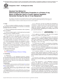 ASTM F2547-18(2023) is a standard published by ASTM International. Its full title is "Standard Test Method for Determining the Attenuation Properties in a Primary X-ray Beam of Materials Used to Protect Against Radiation Generated During the Use of X-ray Equipment". This standard covers: SIGNIFICANCE AND USE 5.1 This test method is intended to provide a standardized test procedure of protective materials to ensure comparable results among manufacturers and users. 5.2 This test method involves measurement of the attenuation of X-rays by protective clothing material at an accelerating potential (kVp) between 60 and 130 kVp. These energies are considered to be representative of those commonly used during medical diagnosis. 5.3 The reporting of the attenuation at a specific X-ray energy is intended to allow the end user organization to assess the attenuating properties of the protective clothing material at that energy level. SCOPE 1.1 This test method establishes procedures for measuring the attenuation of X-rays by protective materials at accelerating potentials from 60 to 130 kVp. 1.2 This test method provides attenuation values of primary beam X-radiation. 1.3 This test method applies to both leaded and non-leaded radiation protective clothing materials. 1.4 This standard does not purport to address all of the safety concerns, if any, associated with its use. It is the responsibility of the user of this standard to establish appropriate safety, health, and environmental practices and determine the applicability of regulatory limitations prior to use. 1.5 This international standard was developed in accordance with internationally recognized principles on standardization established in the Decision on Principles for the Development of International Standards, Guides and Recommendations issued by the World Trade Organization Technical Barriers to Trade (TBT) Committee.
