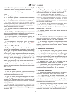SIGNIFICANCE AND USE 5.1 This test method is intended to provide a standardized test procedure of protective materials to ensure comparable results among manufacturers and users. 5.2 This test method involves measurement of the attenuation of X-rays by protective clothing material at an accelerating potential (kVp) between 60 and 130 kVp. These energies are considered to be representative of those commonly used during medical diagnosis. 5.3 The reporting of the attenuation at a specific X-ray energy is intended to allow the end user organization to assess the attenuating properties of the protective clothing material at that energy level. SCOPE 1.1 This test method establishes procedures for measuring the attenuation of X-rays by protective materials at accelerating potentials from 60 to 130 kVp. 1.2 This test method provides attenuation values of primary beam X-radiation. 1.3 This test method applies to both leaded and non-leaded radiation protective clothing materials. 1.4 This standard does not purport to address all of the safety concerns, if any, associated with its use. It is the responsibility of the user of this standard to establish appropriate safety, health, and environmental practices and determine the applicability of regulatory limitations prior to use. 1.5 This international standard was developed in accordance with internationally recognized principles on standardization established in the Decision on Principles for the Development of International Standards, Guides and Recommendations issued by the World Trade Organization Technical Barriers to Trade (TBT) Committee.