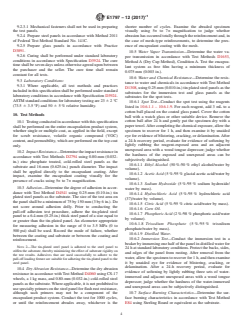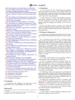 ABSTRACT This specification covers minimum material performance requirements and laboratory test procedures for reinforced liquid coating encapsulation products (single- or multiple-coat systems) for leaded paint in buildings. It applies to any liquid-applied product incorporating reinforcement materials as part of the system. Reinforcement materials are continuous fabric or mesh and are applied in the field. These materials are typically applied between a base and top coat. These products are used to encapsulate a leaded paint surface with the intent of reducing human exposure to lead in paint. These are classified into three types which are Type I which are encapsulation products are intended for interior use, Type II which are encapsulation products intended for exterior use, and Type III which defines encapsulation products intended for either interior or exterior use. Different tests shall be conducted in order to determine the following performance properties for reinforced liquid coating encapsulation products such as impact resistance, adhesion, dry abrasion resistance, water vapor transmission, water resistance, chemical resistance, surface burning characteristics, volatile organic compound content, weathering, aging, scrub resistance, mildew resistance, paint ability and repairability. Testing conducted shall be performed on the entire encapsulation product system, whether single or multiple coat, as applied in the field, except for scrub resistance, volatile organic compound (VOC) content, and permeability, which are performed on the top coat only. SCOPE 1.1 This specification covers minimum material performance requirements and laboratory test procedures for reinforced liquid coating encapsulation products (single- or multiple-coat systems) for leaded paint in buildings. Performance properties addressed in this specification are: 1.1.1 Impact Resistance, 1.1.2 Adhesion, 1.1.3 Dry Abrasion Resistance, 1.1.4 Water Vapor Transmission, 1.1.5 Water and Chemical Resistance, 1.1.6 Surface Burning Characteristics, 1.1.7 Volatile Organic Compound (VOC) Content, 1.1.8 Weathering, 1.1.9 Aging, 1.1.10 Scrub Resistance, 1.1.11 Mildew Resistance, 1.1.12 Paintability/Repairability, 1.2 This specification does not address the selection of an encapsulation product for specific use conditions. Specific use conditions may require performance values other than those stated in this specification. See Guide E1796 for guidance. 1.3 This specification complements Specification E1795 for non-reinforced liquid coating encapsulation products. 1.4 This specification does not cover the use of encapsulation products on industrial steel structures nor residential exterior coated metal surfaces because no corrosion control requirements are included. 1.5 This specification applies to any liquid-applied product incorporating reinforcement materials as part of the system. Reinforcement materials are continuous fabric or mesh and are applied in the field. These materials are typically applied between a base and top coat. These products are used to encapsulate a leaded paint surface with the intent of reducing human exposure to lead in paint. 1.6 The results of the test methods included in this specification will not necessarily predict field performance. 1.7 The values stated in SI units are to be regarded as the standard. The values given in parentheses are for information only. 1.8 This standard does not purport to address all of the safety concerns, if any, associated with its use. It is the responsibility of the user of this standard to establish appropriate safety, health, and environmental practices and determine the applicability of regulatory limitations prior to use. 1.9 This international standard was developed in accordance with internationally recognized principles on standardization established in the Decision on Principles for the Development of International Sta...