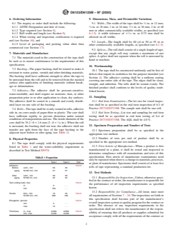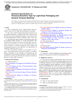 ABSTRACT This specification covers paper-backed pressure sensitive tapes used for light-duty packaging and masking. The paper presents two types of pressure-sensitive tape: type I - crepe paper backed, and type II - flat paper backed. The materials used in the construction of the tape shall be such as to ensure conformance to the requirements specified. The tape shall comply with the physical requirements specified. Specimen preparation shall be as specified in the appropriate test method. Number of tests per unit of product shall be as specified in the appropriate test method. Accelerated aging, adhesion, tensile and elongation, tack, and thickness shall be tested to meet the requirements specified. SCOPE 1.1 This specification covers paper-backed pressure-sensitive tapes used for light-duty packaging and masking. 1.2 The values stated in either inch-pound or SI units are to be regarded separately as standard. The values stated in each system are not exact equivalents; therefore, each system must be used independently, without combining values in any way. 1.3 The following safety hazards caveat pertains only to the test methods portion, Section 13, of this specification. This standard does not purport to address all of the safety concerns, if any, associated with its use. It is the responsibility of the user of this standard to establish appropriate safety, health, and environmental practices and determine the applicability of regulatory limitations prior to use. 1.4 This international standard was developed in accordance with internationally recognized principles on standardization established in the Decision on Principles for the Development of International Standards, Guides and Recommendations issued by the World Trade Organization Technical Barriers to Trade (TBT) Committee.